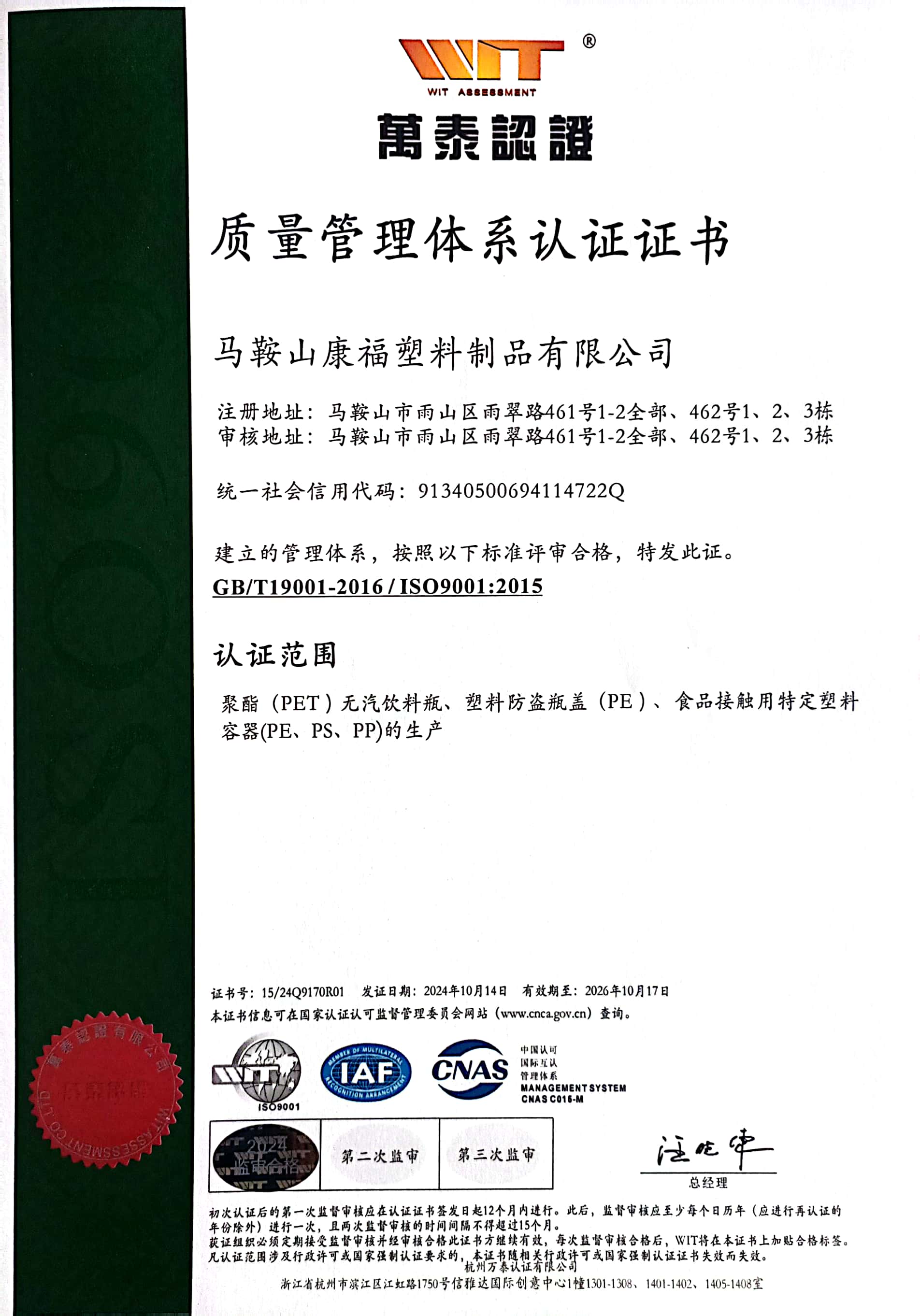 質(zhì)量管理體系認證證書